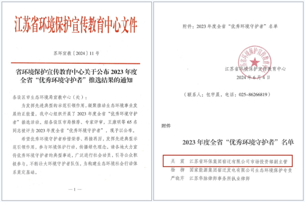 省環(huán)保集團(tuán)宿遷有限公司吳震入選全省“優(yōu)秀環(huán)境守護(hù)者”